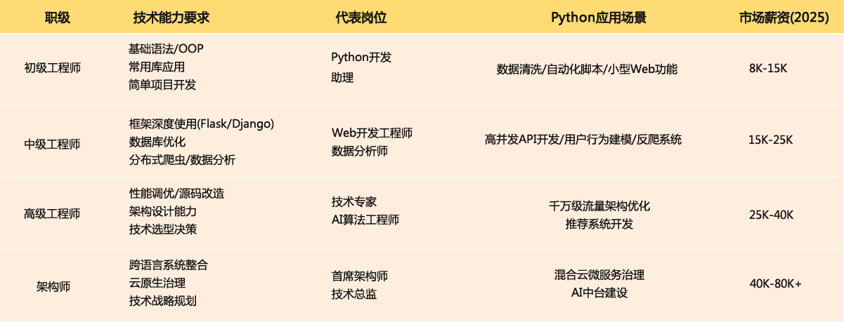學(xué)習(xí)Python是踏入未來(lái)技術(shù)世界的高效通行證——它憑借接近自然語(yǔ)言的簡(jiǎn)潔語(yǔ)法,讓零基礎(chǔ)者最快21天就能開(kāi)發(fā)實(shí)用程序;作為AI、數(shù)據(jù)分析、自動(dòng)化領(lǐng)域的核心工具,全球82%的AI項(xiàng)目基于Python構(gòu)建(GitHub 2025數(shù)據(jù));同時(shí)提供百萬(wàn)級(jí)高薪機(jī)會(huì),掌握Python的開(kāi)發(fā)者平均薪資較其他語(yǔ)言高出23%(BOSS直聘統(tǒng)計(jì)),且應(yīng)用場(chǎng)景覆蓋金融量化、爬蟲(chóng)開(kāi)發(fā)、Web服務(wù)等全技術(shù)棧,讓你用最少的學(xué)習(xí)成本撬動(dòng)最大職業(yè)可能性。